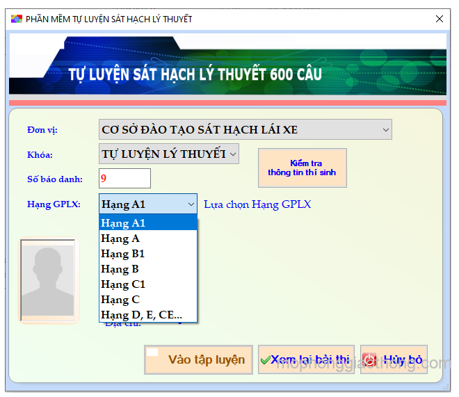 - Bước 3: Trong mục “Hạng GPLX”, chọn loại bằng bạn muốn thi thử bài thi lý thuyết (A1, A, B1, B, C1, C, D, E, CE…)